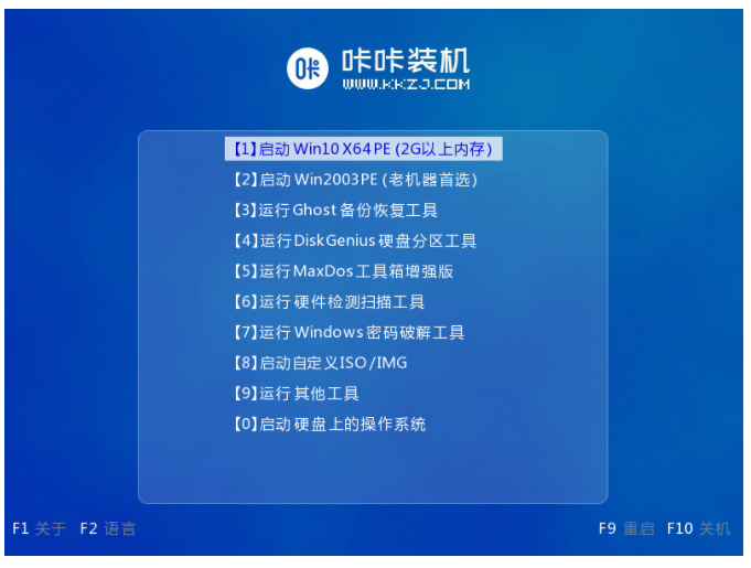 4、把u盘启动盘插入电脑接口中,开机不断按启动快捷键进启动界面,选择u盘启动项按回车进入咔咔pe系统。