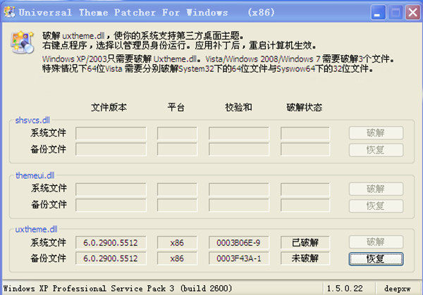 4. XP/2003只需要破解一个文件:uxtheme.dll;