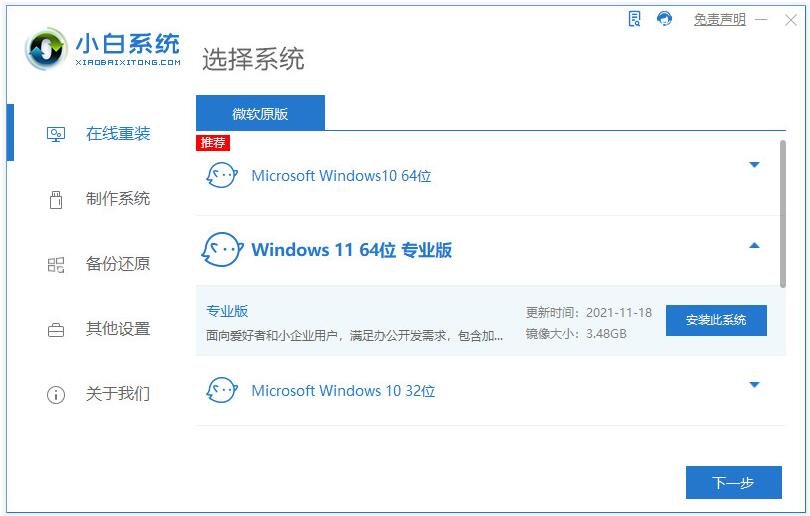 1、首先打开小白一键重装系统工具,选择需要安装的win11系统,点击下一步。